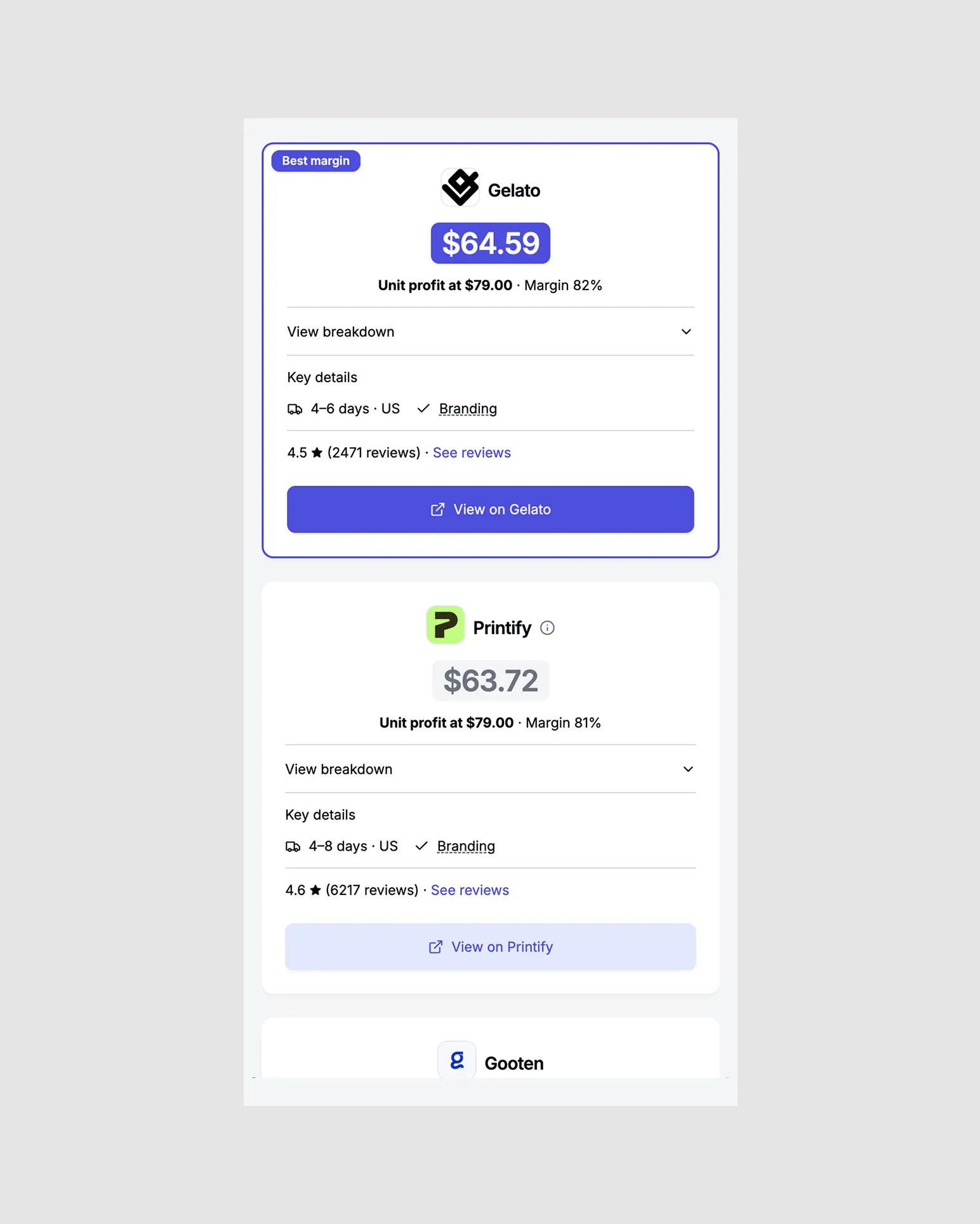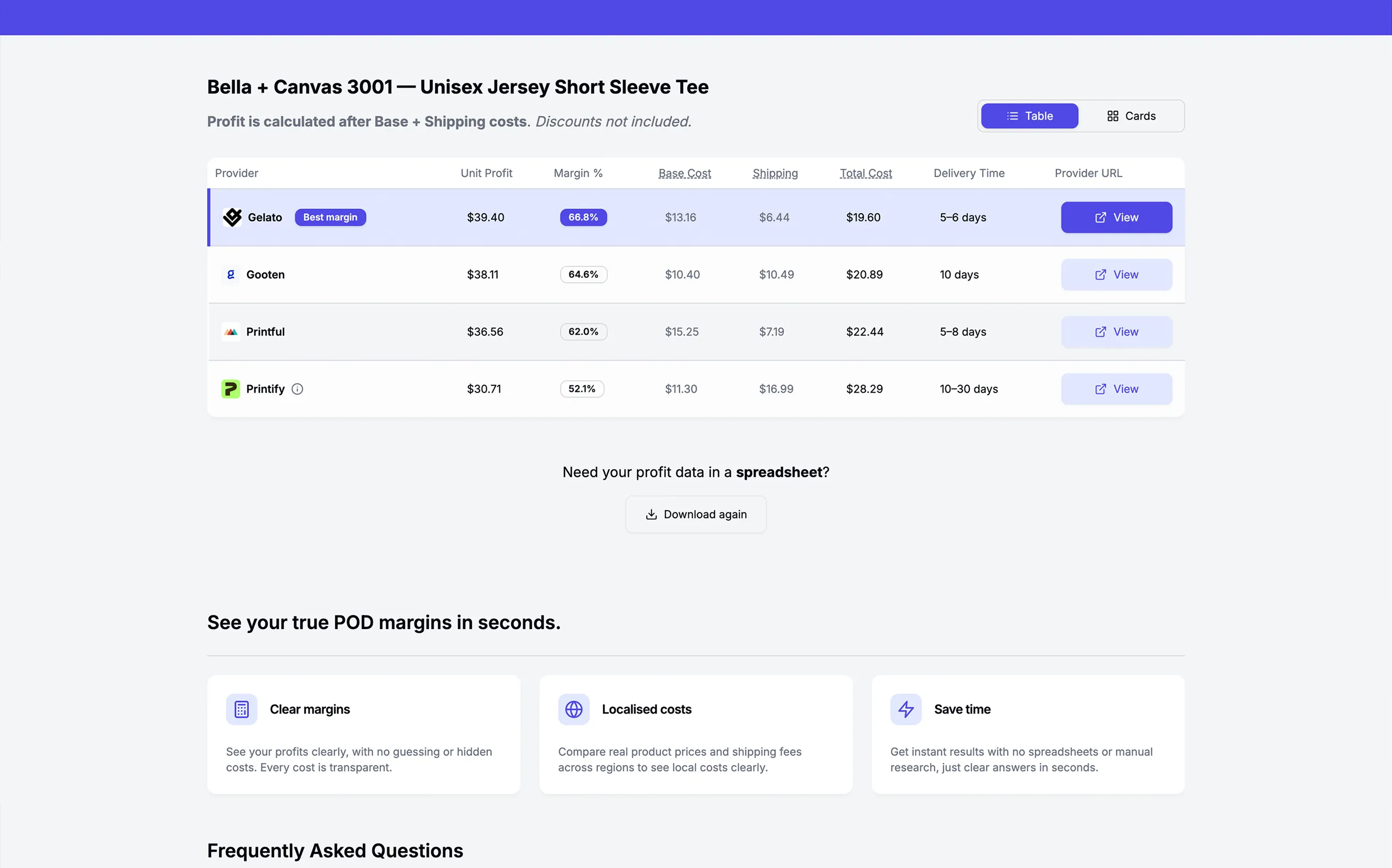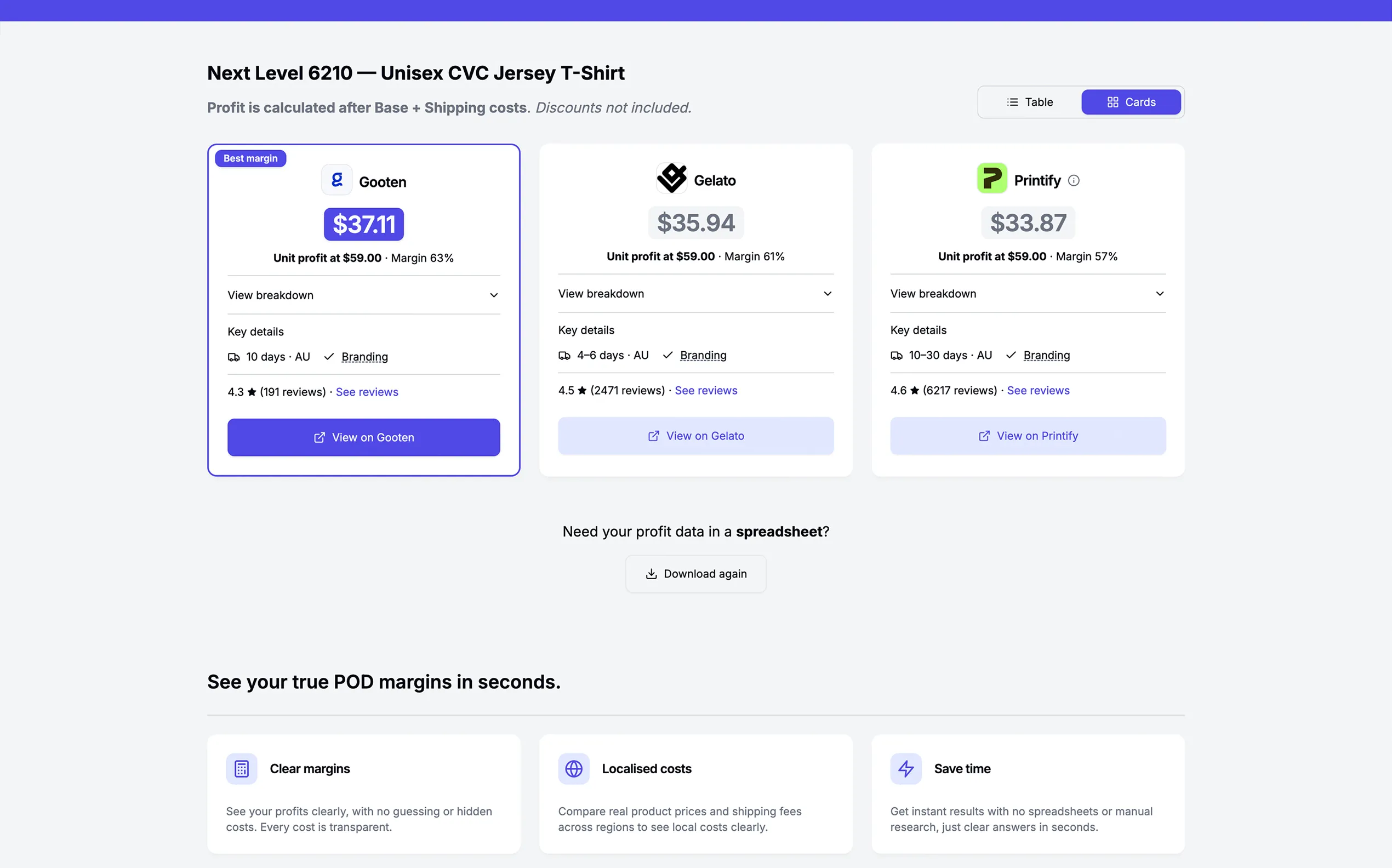 Print on Demand sellers manually compare profit margins across providers using spreadsheets. Each calculation takes 15-20 minutes and becomes outdated as pricing shifts.